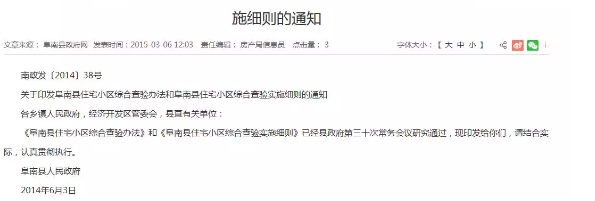 据了解,阜南县于2014年6月开始全面实施住宅小区综合查验工作机制,所有住宅小区项目未经综合查验合格不予办理包括房产证在内的相关审批手续。具体为县综合查验领导小组办公室受理住宅小区项目综合查验申请,牵头组织国土、建设、规划、市容、房产、电力、污水处理、人防、地震、消防等多家部门单位集中参与并分别开展专项查验,所有专项查验合格即为综合查验合格。