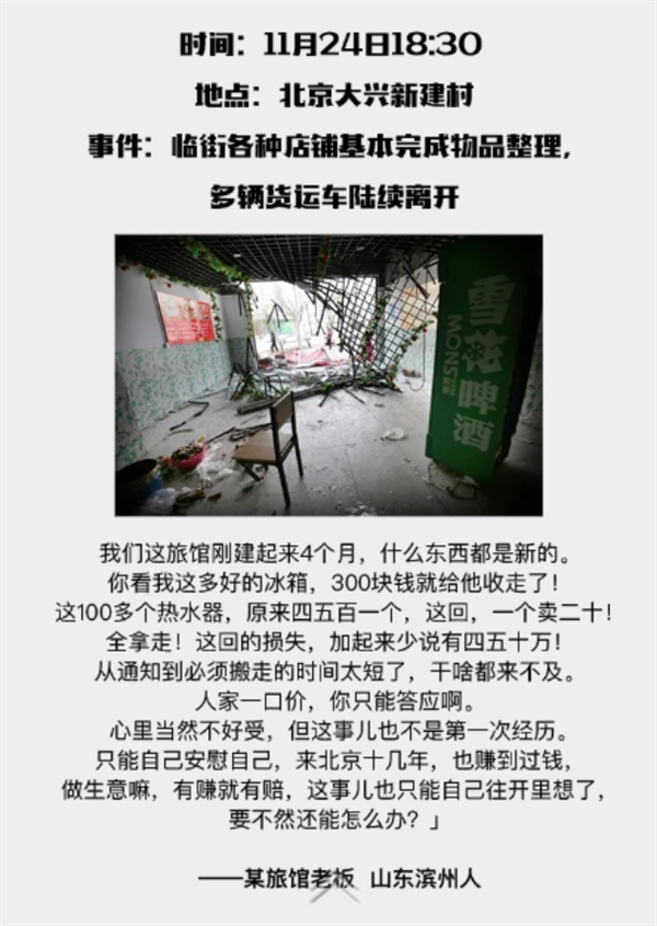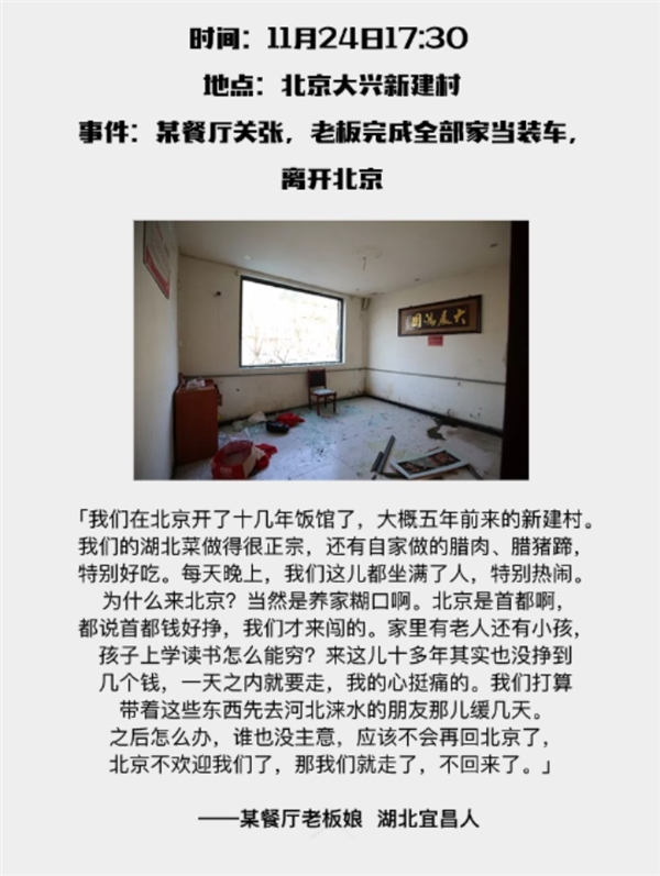 因为大兴的一场火灾事故,北京这个神奇的首都,开始了大规模的外来人口整治,拉开了在京漂泊和拼搏的打工一族的大迁移序幕!