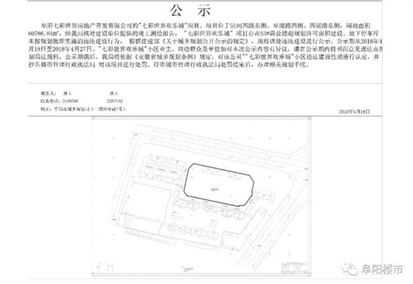 阜阳七彩世界房地产开发有限公司的“七彩世界欢乐城”项目。项目位于清河西路南侧、阜南路西侧、西湖路东侧,用地面积60786.83平方米,经我局核对建设单位提供的竣工测绘报告,“七彩世界欢乐城”项目存在S3#商业楼超规划许可面积建设、地下停车库未按规划批准实施的违法建设行为。根据住建部《关于城乡规划公开公示的规定》,现将该处违法建设进行公示。