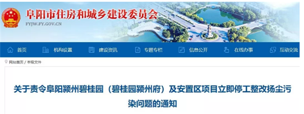 关于责令阜阳颍州碧桂园(碧桂园颍州府)及安置区项目立即停工整改扬尘污染问题的通知