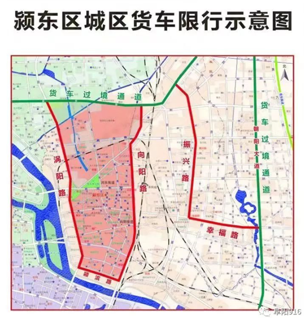 颍东区颍滨路、向阳路、涡阳路、古泉路合围形成的区域全天禁止货车通行。颍滨路(向阳路至涡阳路)、涡阳路(颍滨路至古泉路)、向阳路(颍滨路至古泉路)、振兴路(阜蚌路至幸福路)、幸福路(振兴路至朝阳大道)全天禁止货车通行。