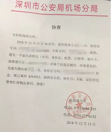 12月13日20时10分,阜阳市公安局机场分局接深圳市公安局机场分局协查通报:
