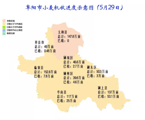 阜阳全市已经收割小麦96.68万亩,6月5日前基本能收割完毕