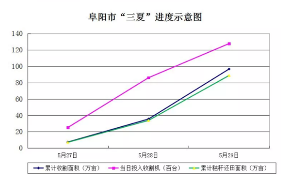 截止5月29日16时,全市已收割小麦96.68万亩,进度为13%,其中颍上53.1万亩,阜南25万亩;当日投入小麦联合收割机12782台(其中跨区作业联合收割机3349台),收割小麦61.2万亩;全市累计秸秆还田面积88.78万亩,秸秆打捆面积1.4万亩。预计6月5日前,全市小麦基本收割完毕。