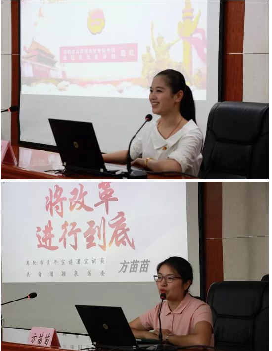 仪式上,阜阳市新时代青年宣讲团骨干宣讲员路政和方苗苗分别围绕“学习贯彻团的十八大精神”和“将改革开放进行到底”两个主题,为与会青年宣讲员作示范宣讲。仪式上还宣读了《关于成立阜阳市新时代青年宣讲团的通知》文件,并为青年宣讲员代表现场颁发了聘书。