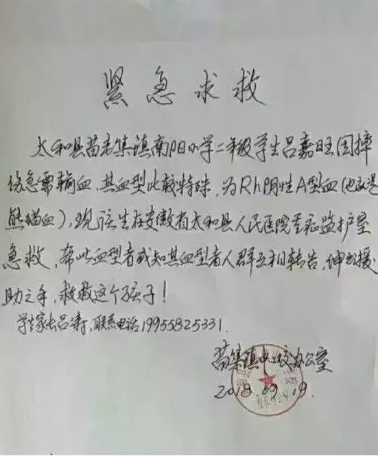 急!急!急!快救救这个可怜的孩子!太和县苗老集镇南阳小学二年级学生吕嘉旺因摔伤急需输血,其血型比较特殊,为Rh阴性A型血(也就是熊猫血),现该学生在太和县人民医院重症监护室急救,希望此血型者或知其血型