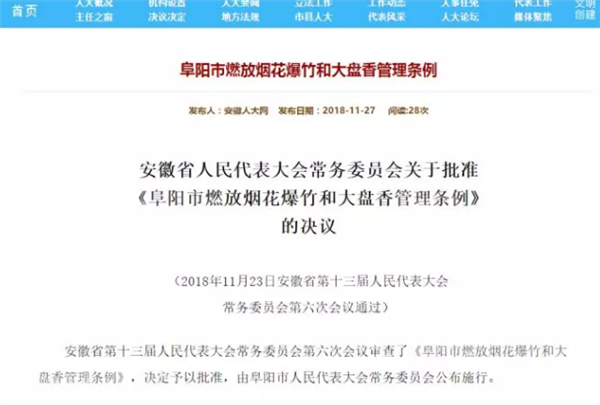 下月起,在阜阳燃放烟花爆竹和大盘香将会被依法处理!最高处10万罚款!日前,《阜阳市燃放烟花爆竹和大盘香管理条例》通过省人大常委会审查批准,从2019年1月1日起开始正式实施,今后违法燃放烟花爆竹和大盘