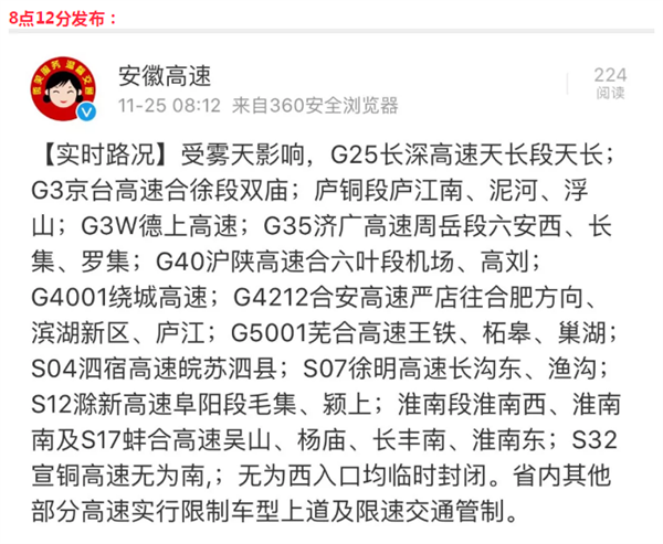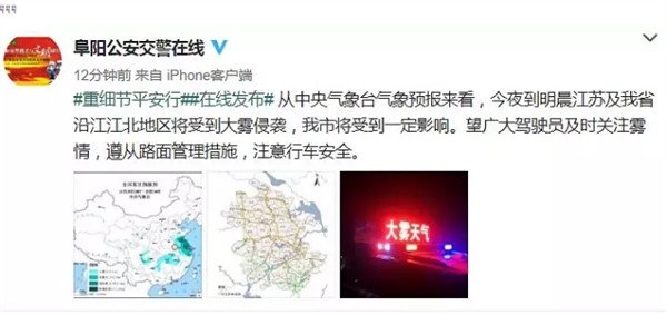 大雾黄色预警阜阳市气象台2018年11月25日02时52分发布大雾黄色预警信号。目前高速公路阜阳南路口和太和、界首、临泉部分路段能见度已经低于500米,出现大雾;预计未来12小时内我市大部分地区将出现